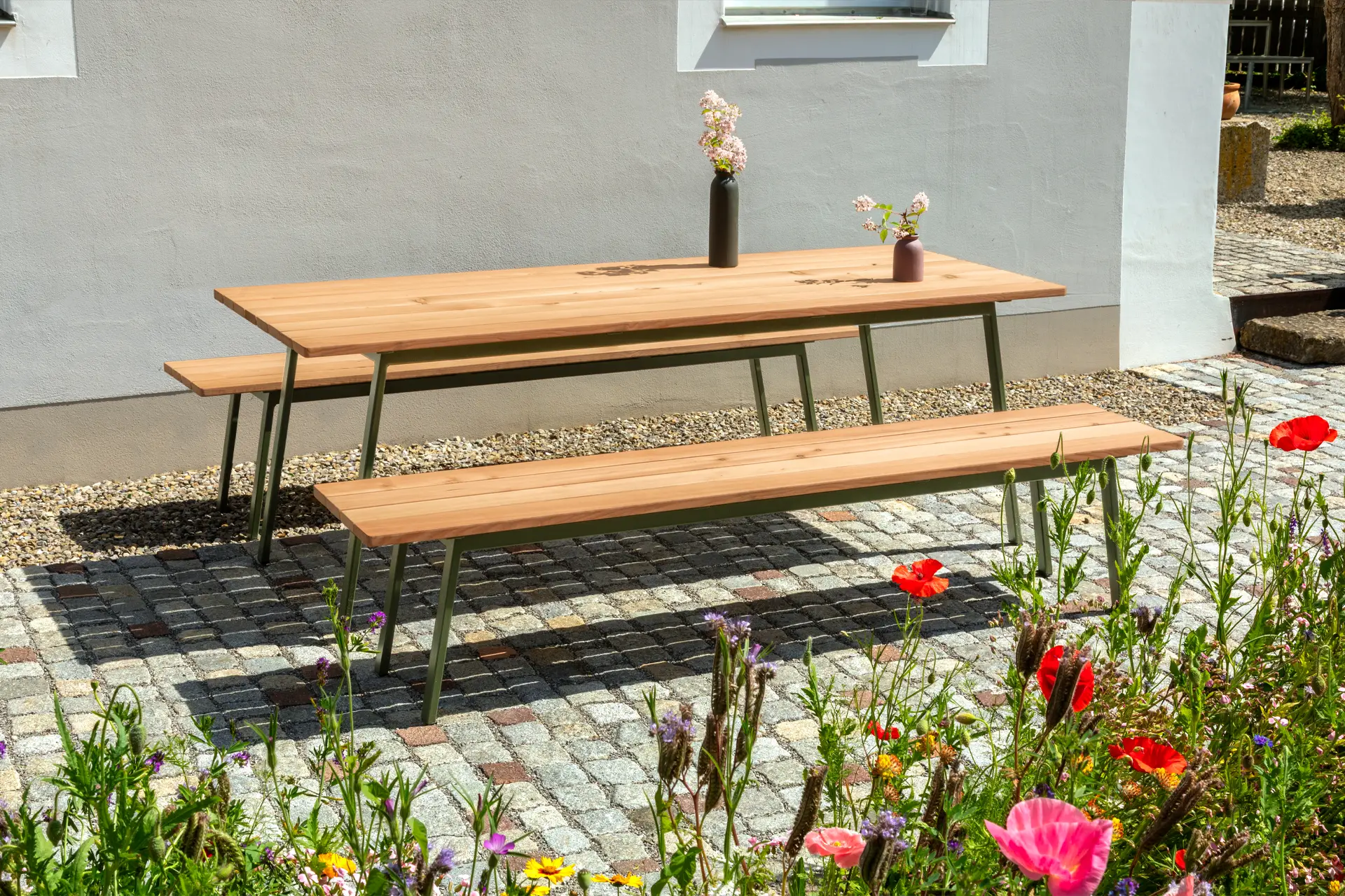 Ob als Esstisch, als Mittelpunkt einer Terrasse oder als langlebige Lösung in der Objekteinrichtung – der at_01 bleibt zeitlos und gewinnt mit jedem Jahr an Charakter.