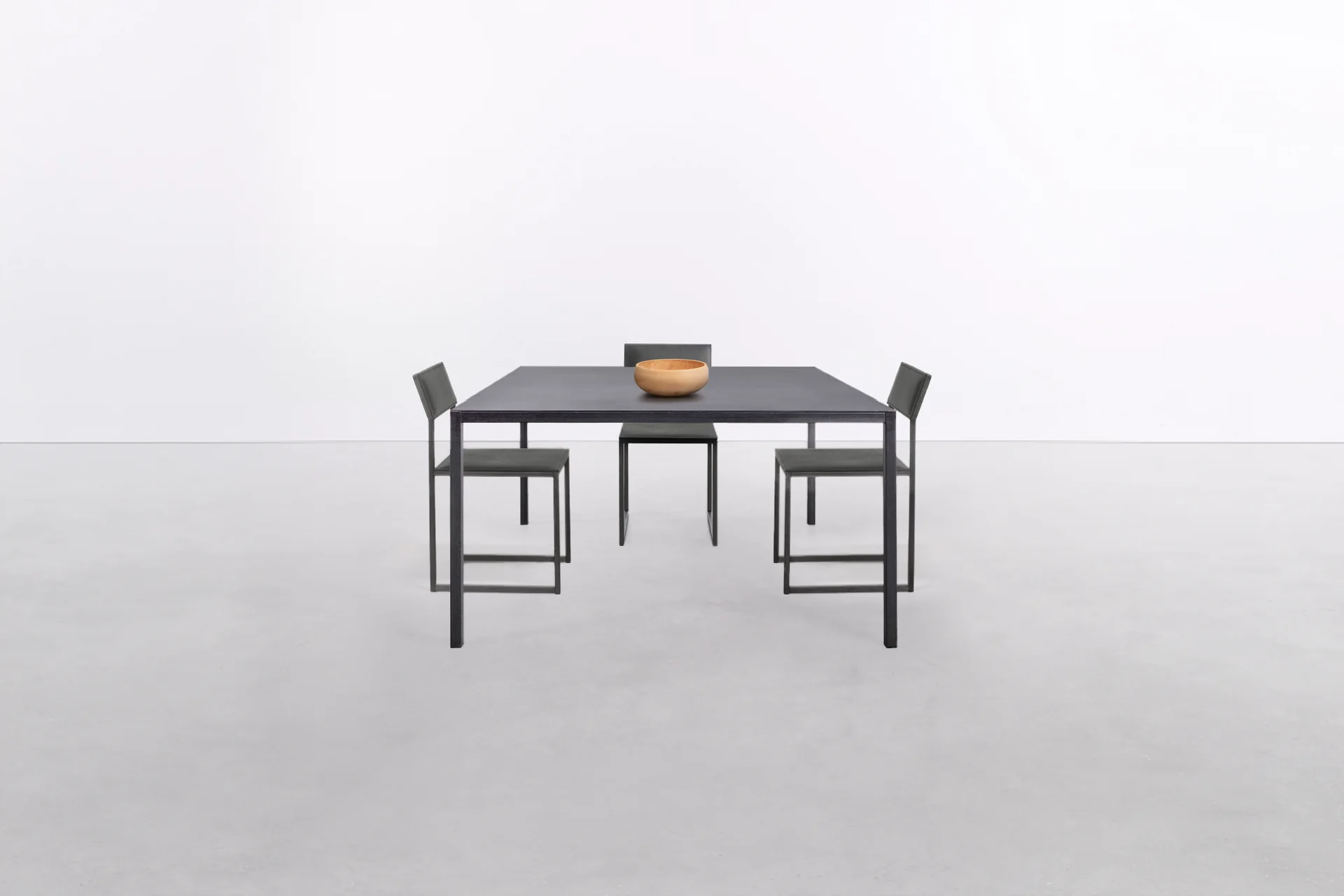 This square table, made entirely of steel, is suitable for both modern and traditional interiors and can be used in residential or contract settings.