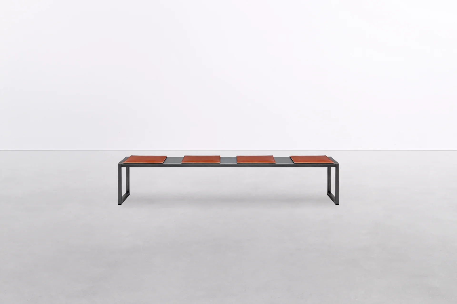 Die Bank on_01 ist aus anthrazitfarbenem Stahl gefertigt. Passend zum Tisch at_01. Ergänzend dazu gibt es die Ledersitzkissen on_L oder on_NL, welche auf der Stahloberfläche durch die unten aufgenähte Magnetfolie rutschsicher haften.