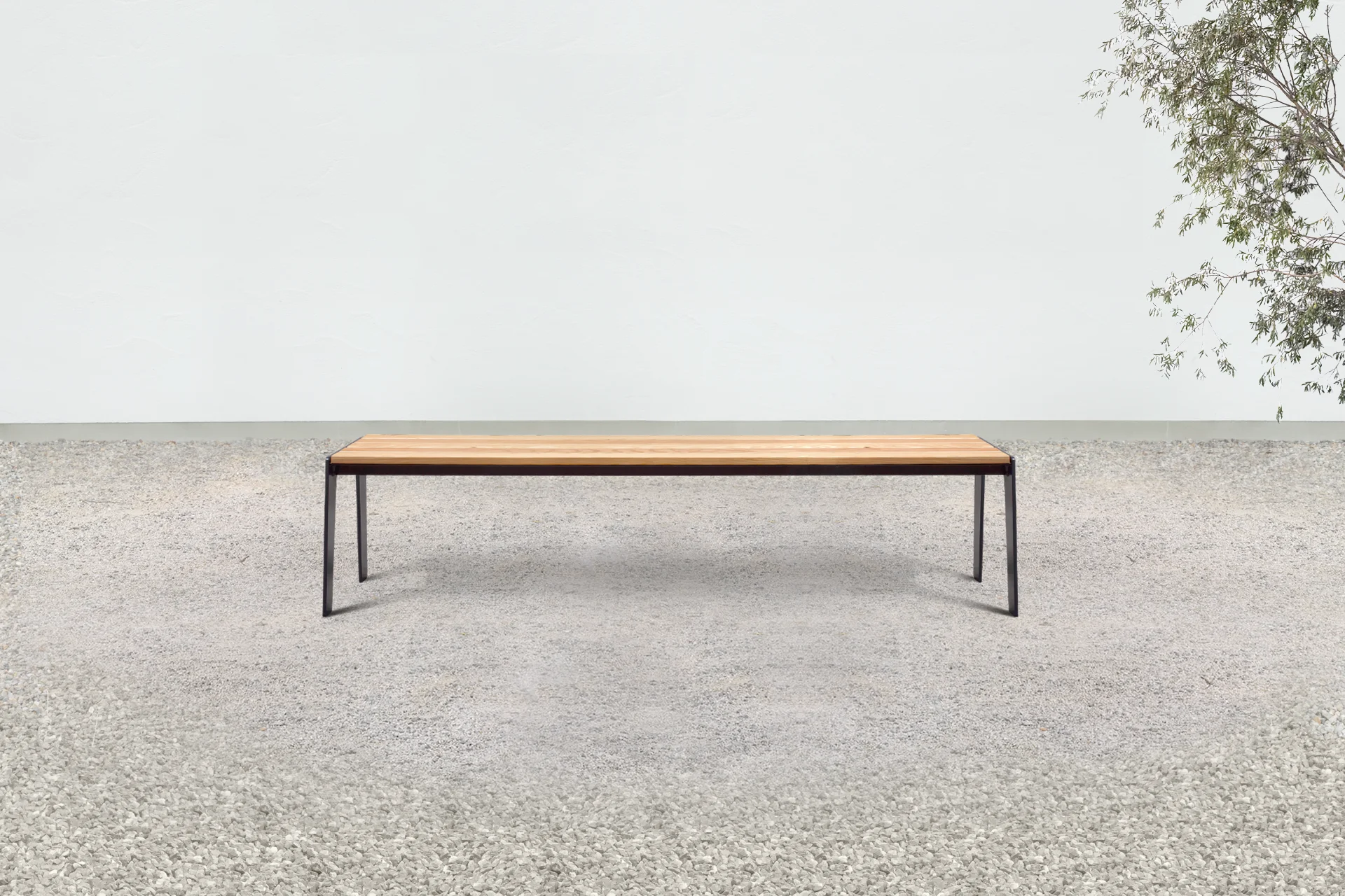 Die Bank  on_14 mit einer Sitzfläche aus gelattetem Lärchenholz kann gut mit dem Tisch at_14 kombiniert werden.