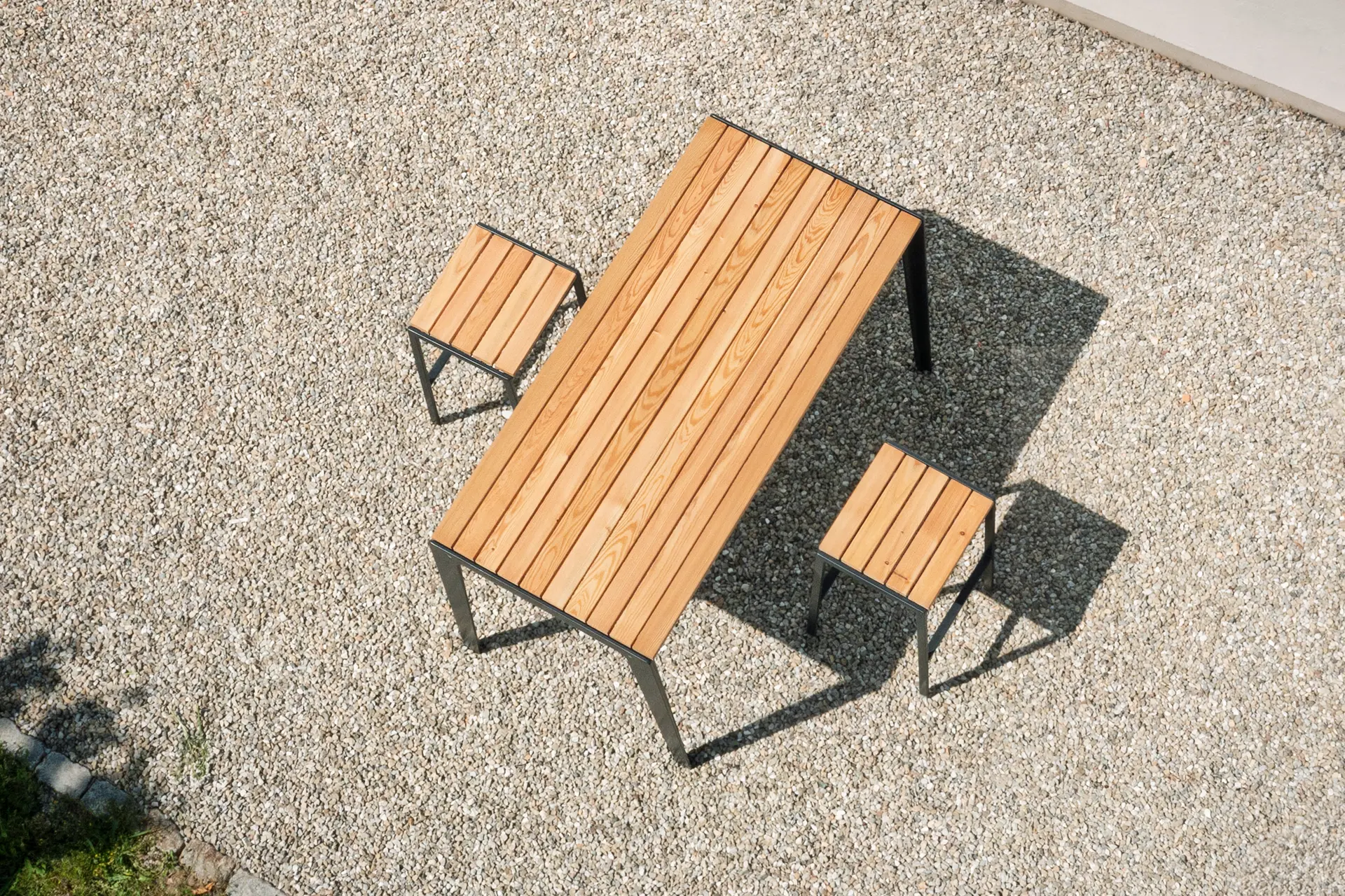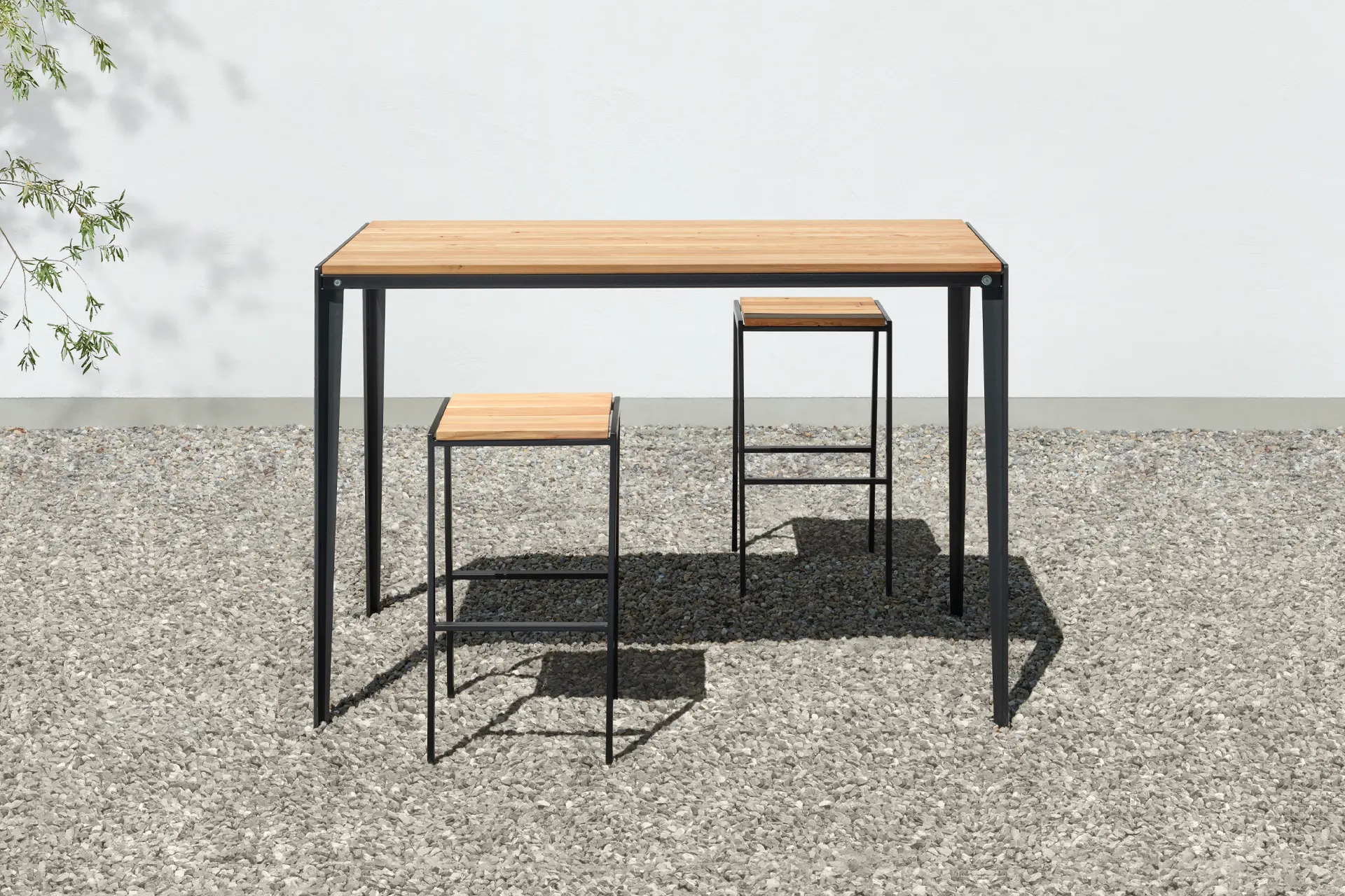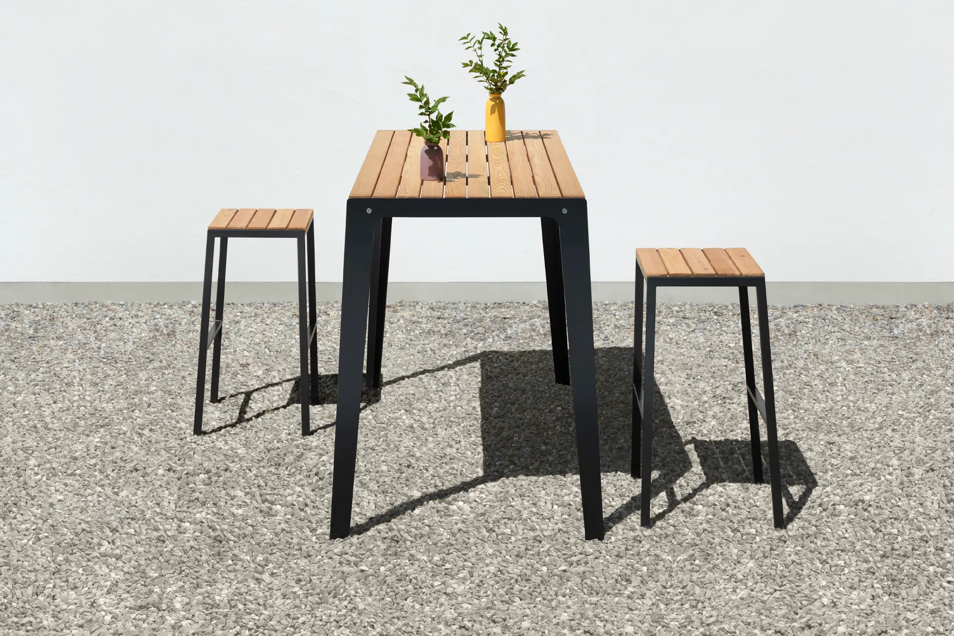Seine leicht schräg gestellten Beine aus pulverbeschichtetem Stahl sorgen für eine markante, gleichzeitig ausgewogene Optik und bilden einen spannenden Kontrast zur gelatteten Tischplatte aus massivem Lärchenholz. Die klare Formensprache macht diesen Tisch zu einem vielseitigen Möbelstück für moderne Außenbereiche.