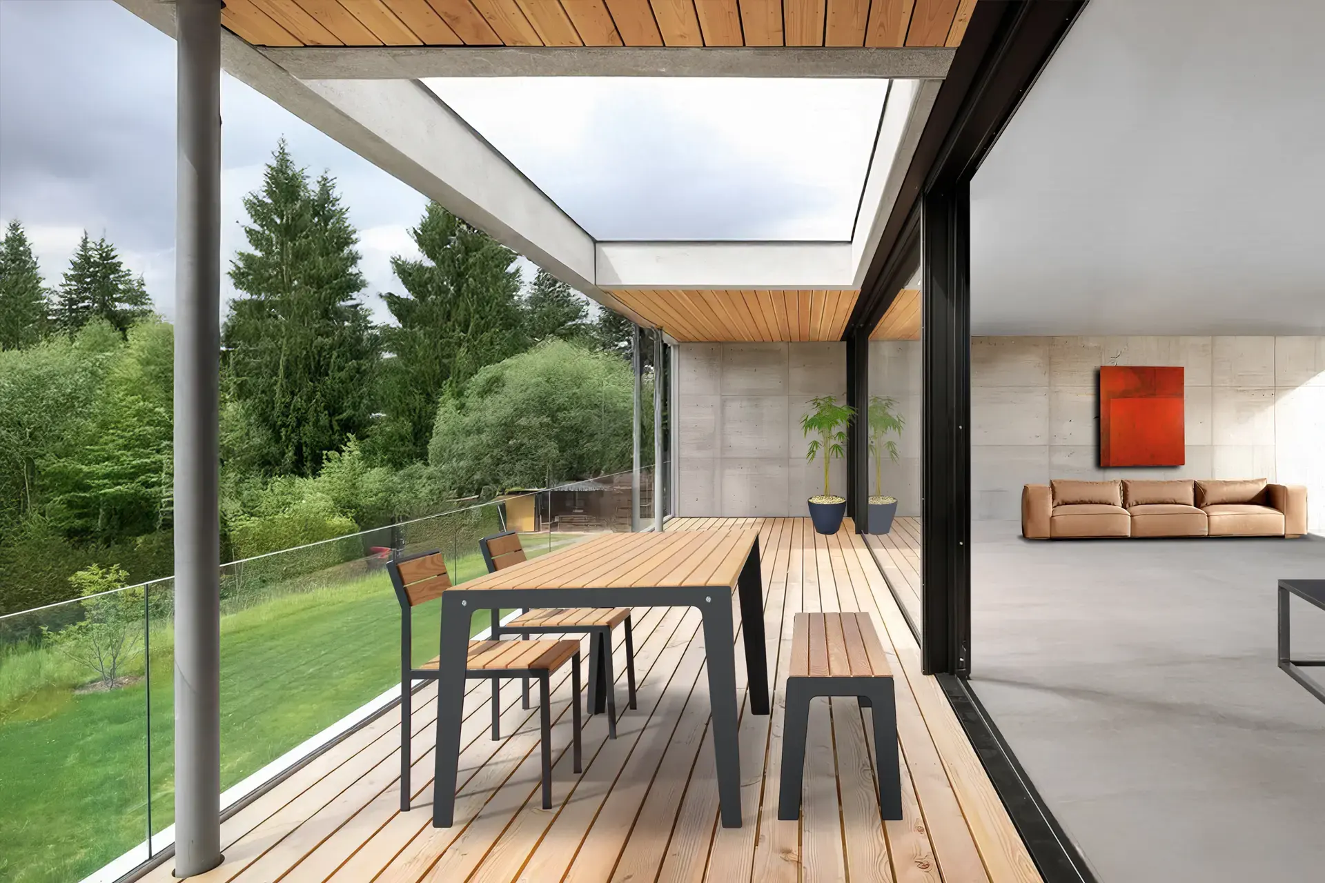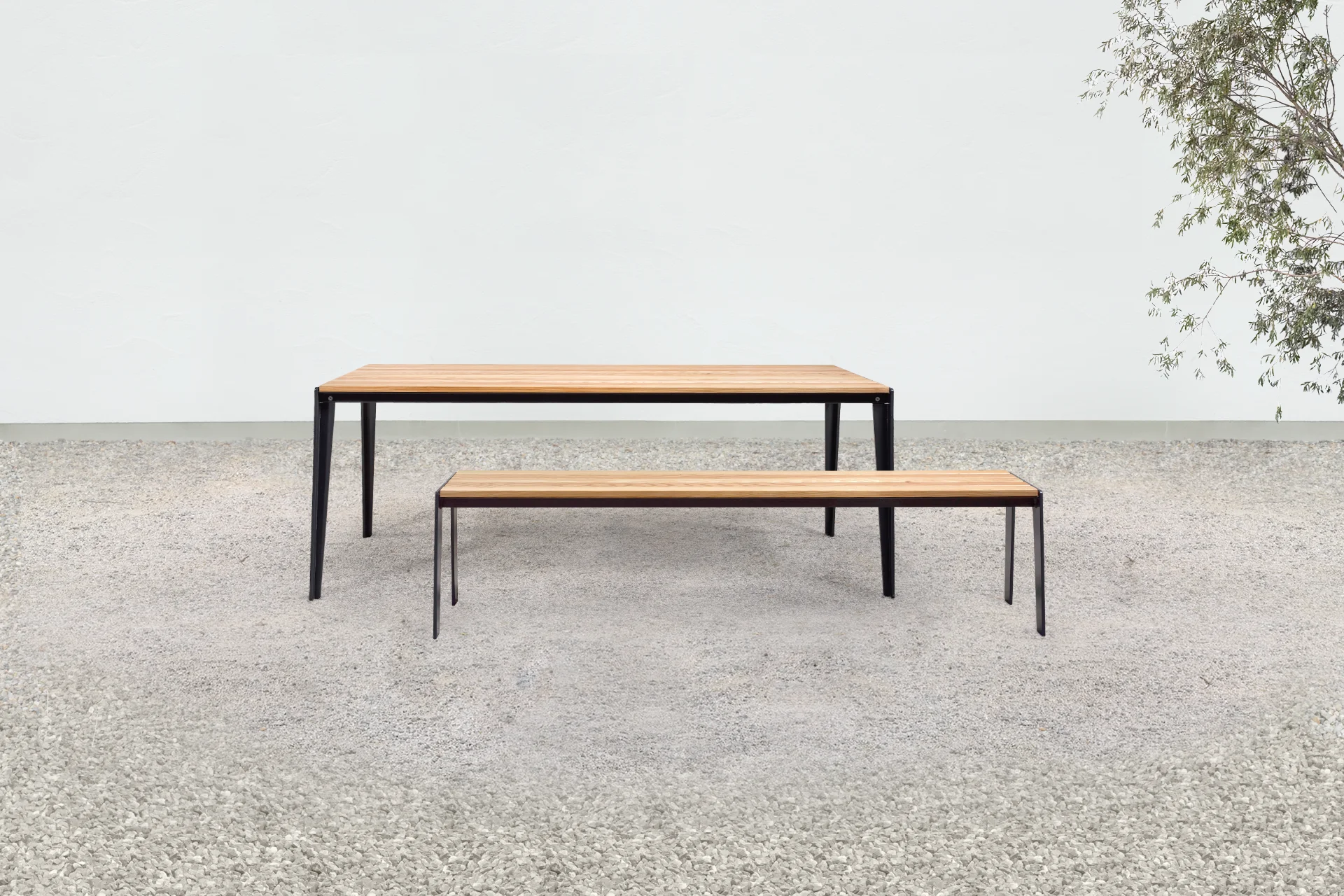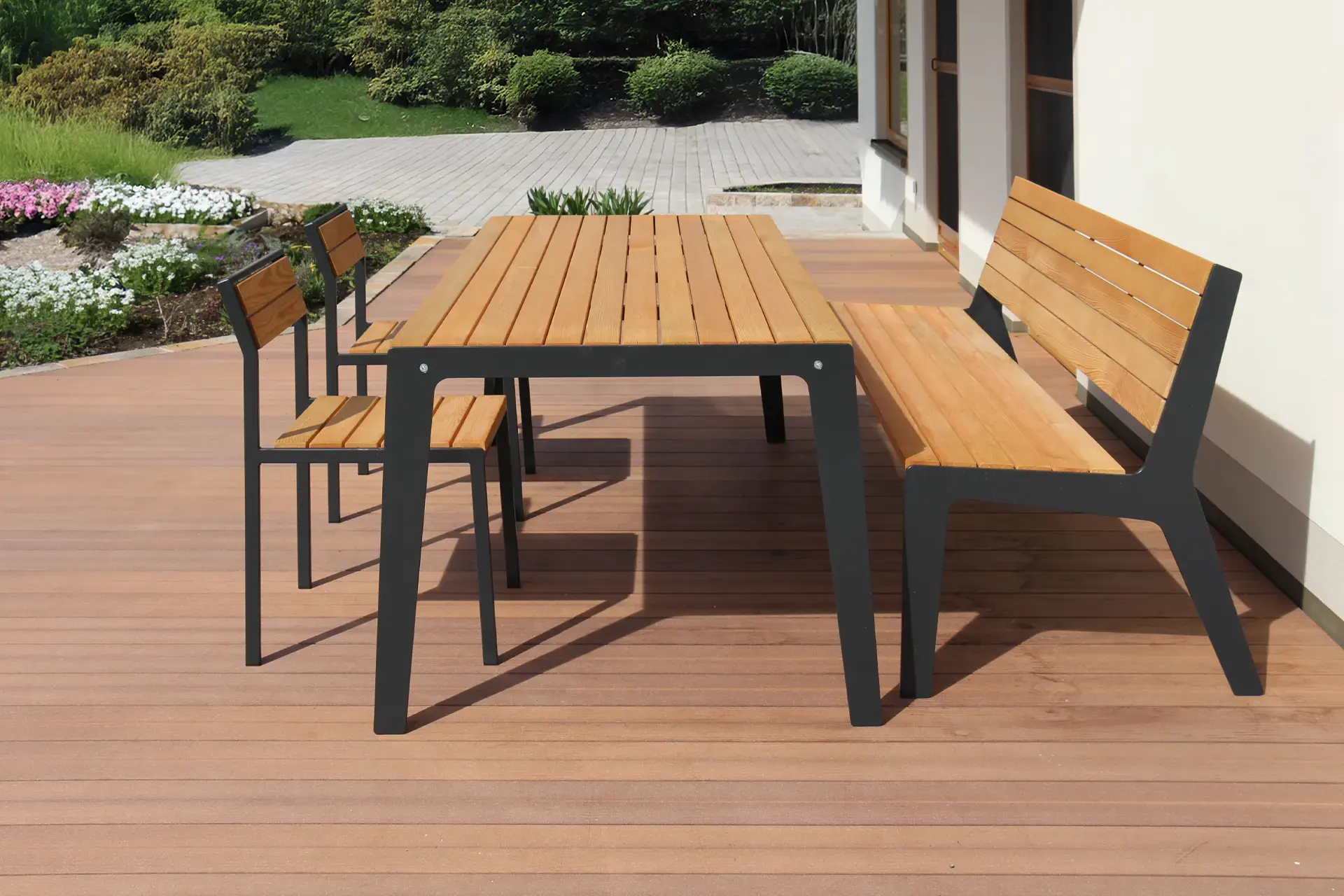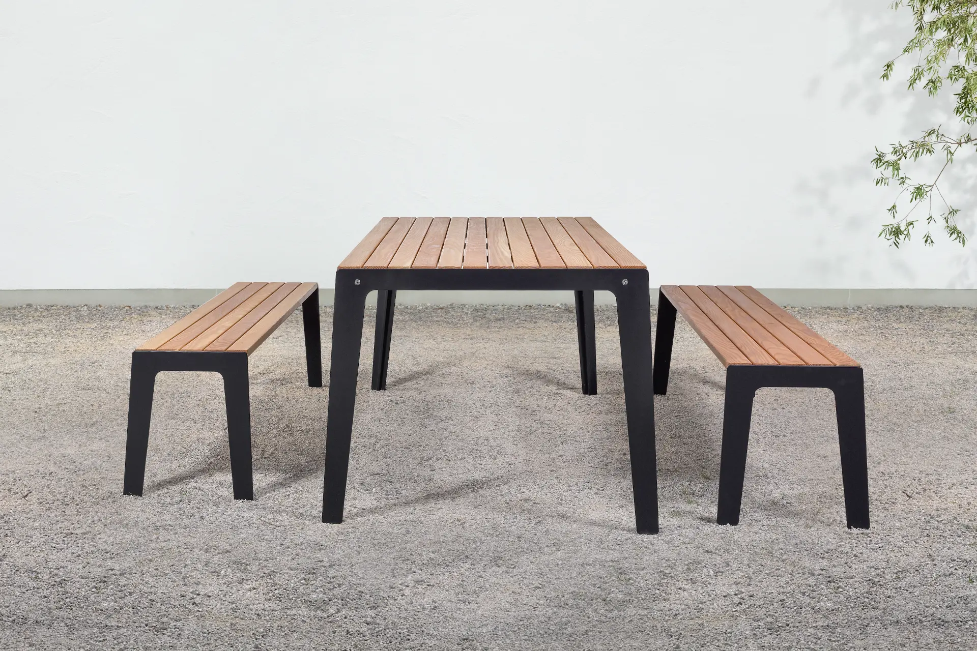 Seine leicht schräg gestellten Beine aus pulverbeschichtetem Stahl sorgen für eine markante, gleichzeitig ausgewogene Optik und bilden einen spannenden Kontrast zur gelatteten Tischplatte aus massivem Lärchenholz. Die klare Formensprache macht diesen Tisch zu einem vielseitigen Möbelstück für moderne Außenbereiche.