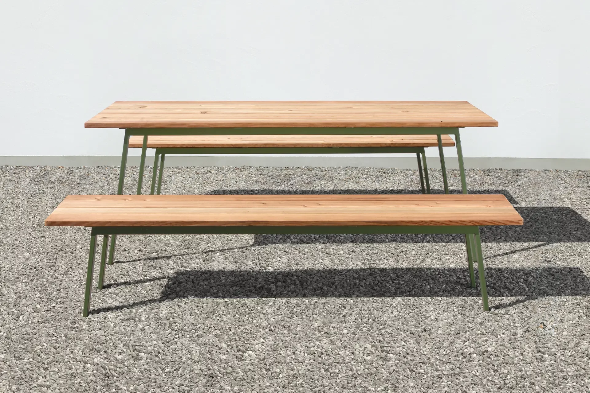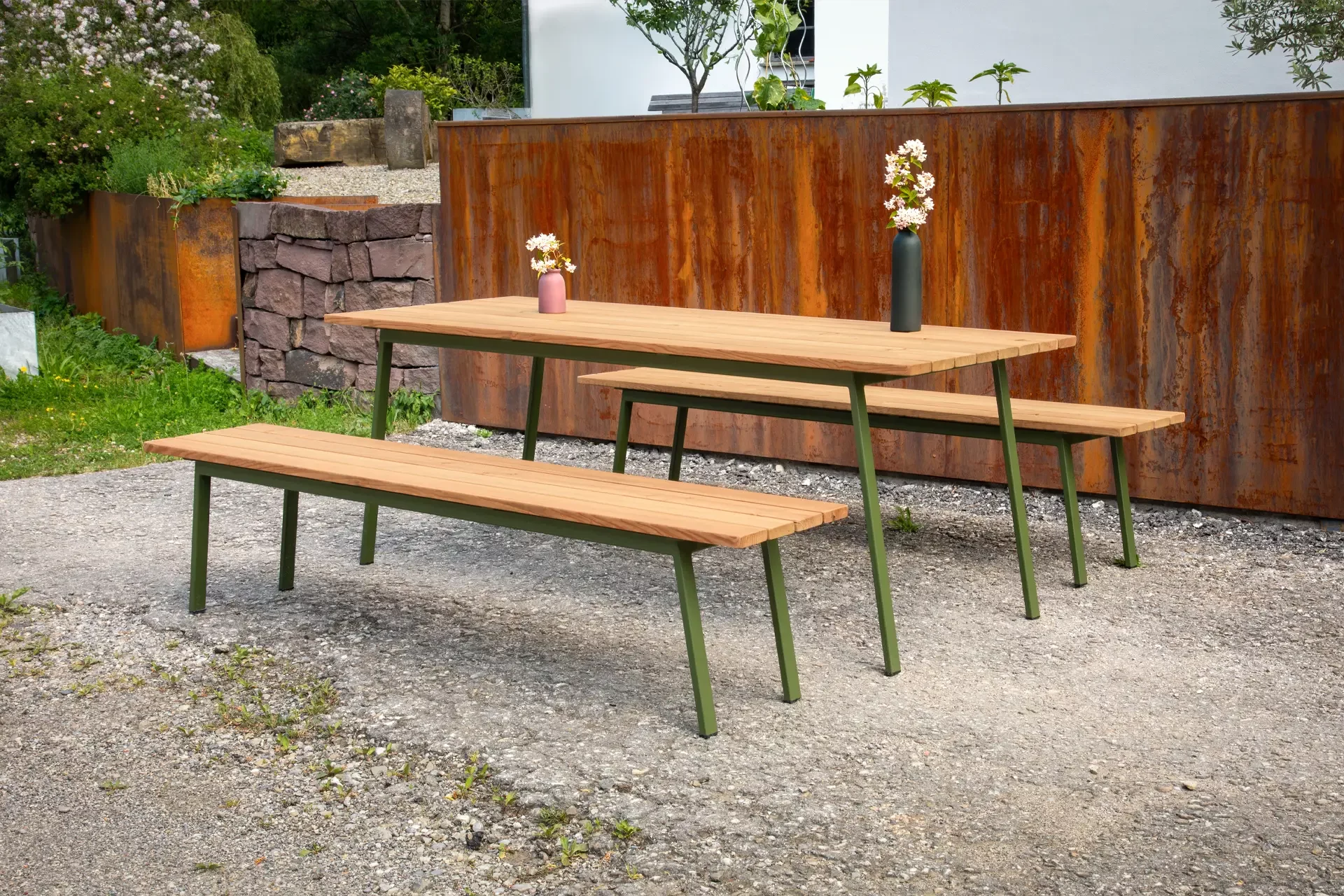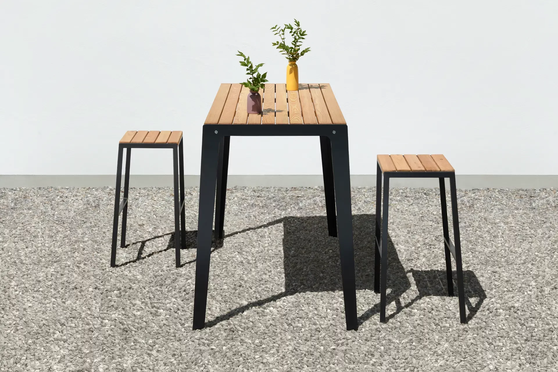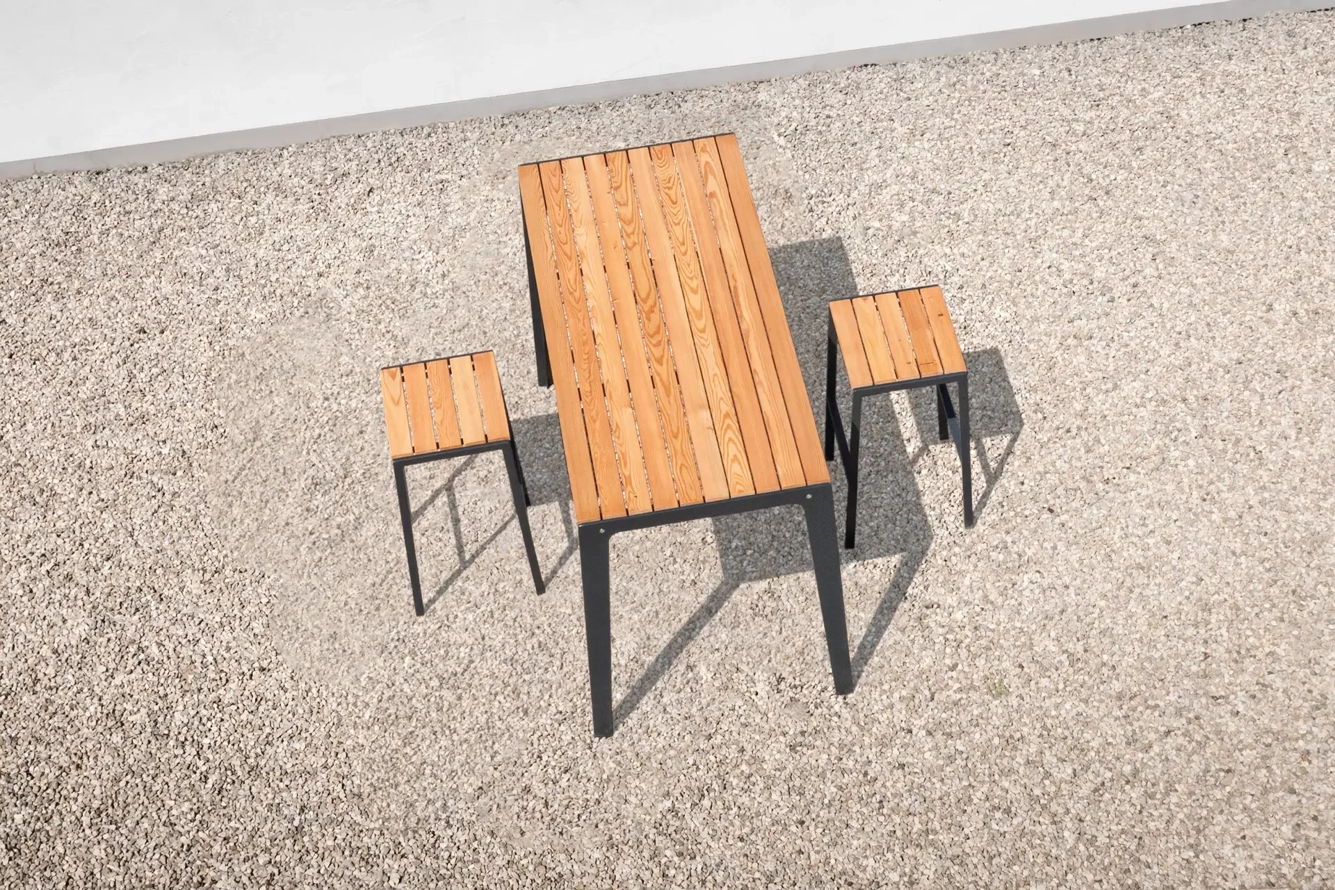 Das neue Ensemble aus Tisch at_22 und Bank on_22 kombiniert widerstandsfähige Lärchenholzleisten mit einer klaren, zeitgemäßen Rahmenform. In Verbindung mit der Farbkombination RAL 7021 (Schwarzgrau) und Lärche entsteht ein prägnantes Highlight für Garten, Gastronomie und öffentliche Bereiche – langlebig, pflegeleicht und stilvoll.