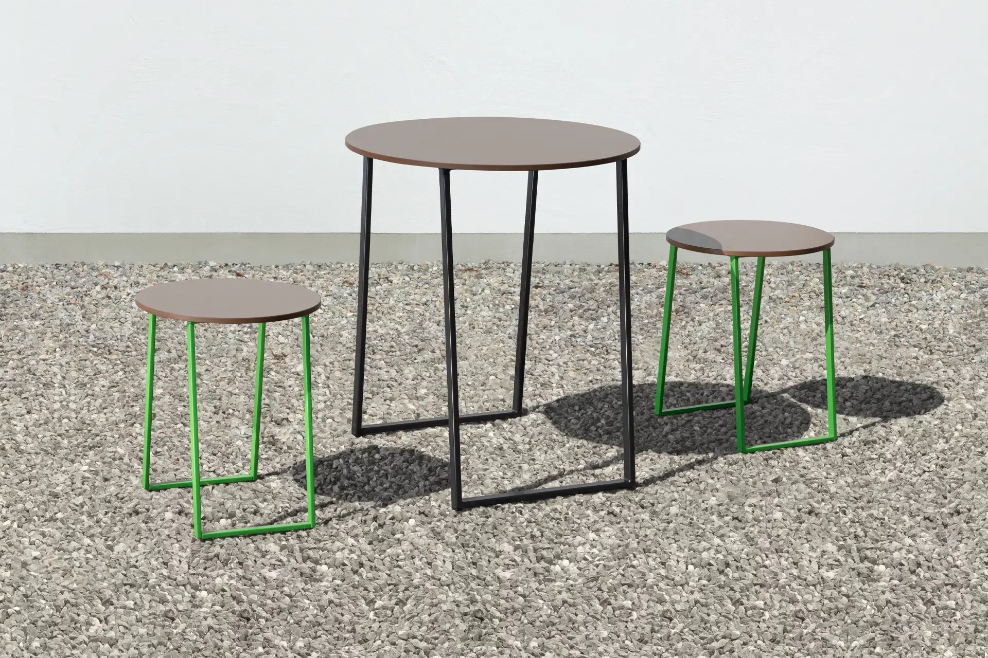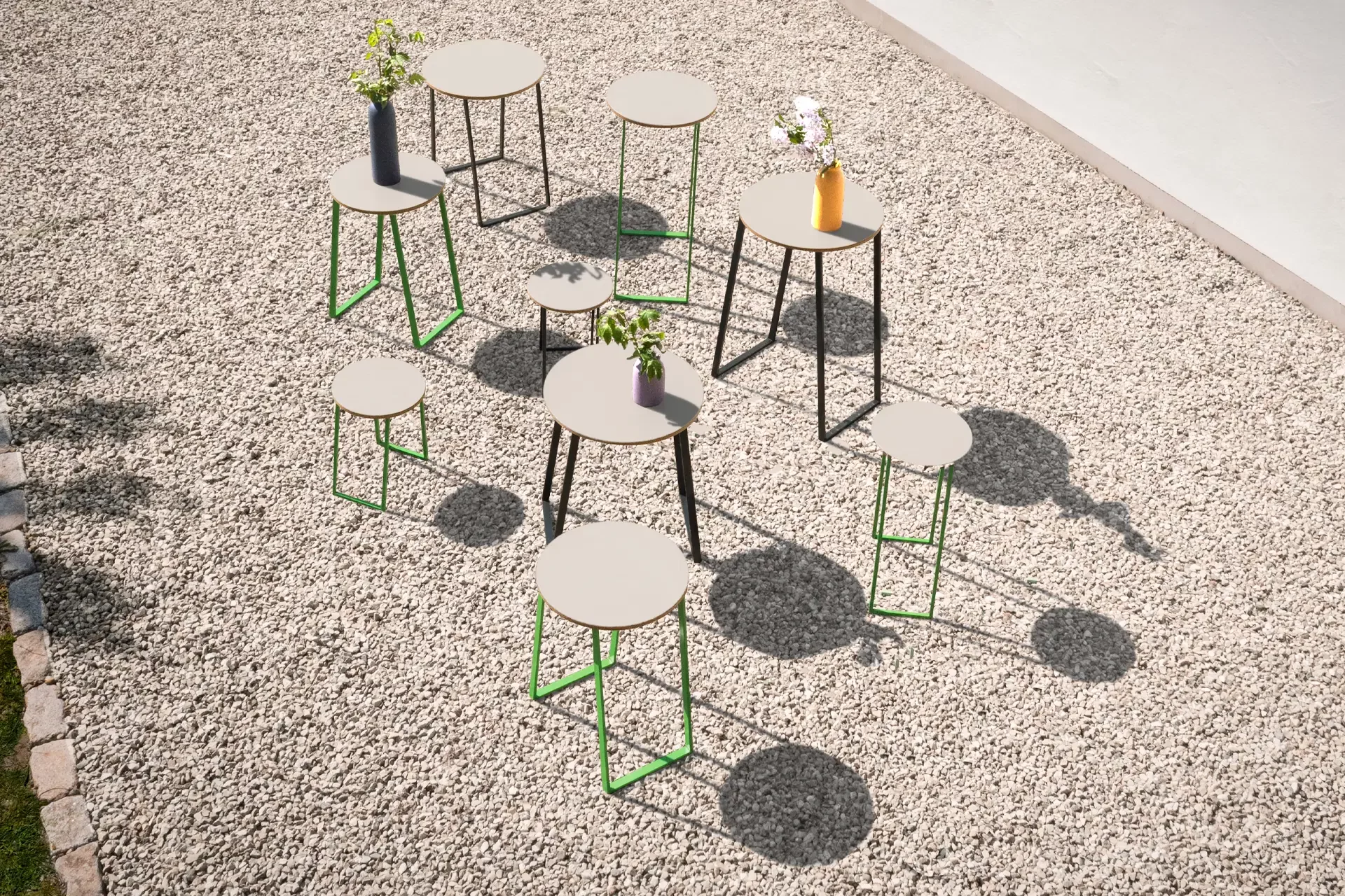 Die neuen Hocker on_24 sind als Sitzgelegenheit oder Beistelltisch nutzbar und in verschiedenen Größen und Farben erhältlich. Gemeinsam mit dem neuen Tisch at_21 bilden sie ein flexibles Ensemble für drinnen und draußen. Die runde Tisch- und Sitzfläche ist dabei eine spannende Neuerung in unserer Kollektion.